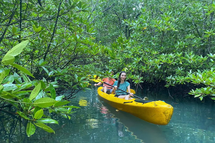 In the afternoon, I joined one of the best things to do in Koh Yao Yai and also my favorite activity during 2 days in Koh Yao Yai – mangrove kayaking. The mangrove forests in the south of Koh Yao Yai are a completely different world, with a rich ecosystem and untouched landscapes. If you ask me what to do in Koh Yao Yai in 2 days to completely immerse yourself in nature, I highly recommend this activity. Paddling through the narrow channels, I felt the serenity and natural beauty around me. I could hear birds singing, leaves rustling, and water gently lapping against the kayak, creating a natural symphony. As the golden sunset painted the waters, the scenery turned magical, making it impossible not to capture every moment of this 2-day Koh Yao Yai itinerary with my camera.