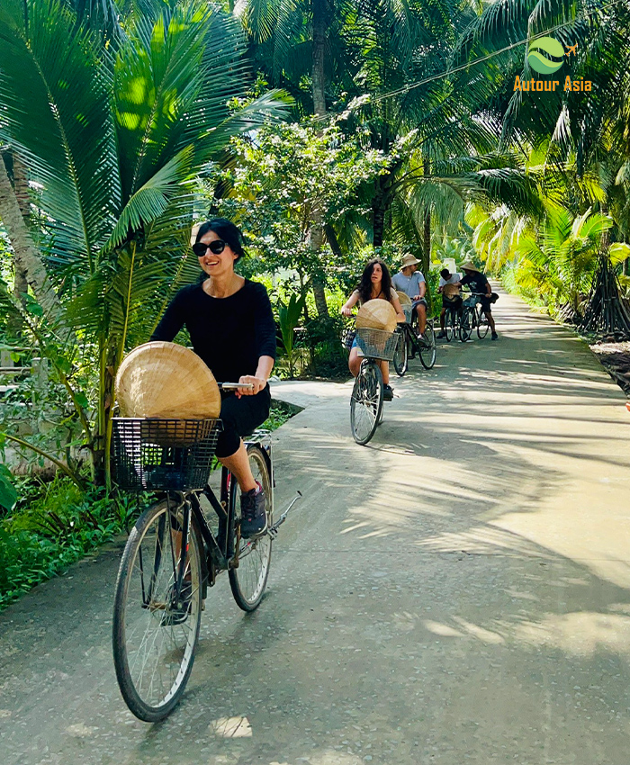Ben Tre. The fresh, fragrant air of the tropical orchards accompanies us as we cycle along shaded paths. After a few pedal strokes, I arrive at a coconut garden and enjoy a freshly picked coconut. Under a traditional three-compartment house, I listen to fascinating stories of the local history. I continue my stroll between golden rice fields, verdant orchards, and peaceful canals, where a few boats drift by. Each landscape is an invitation to serenity. Far from the urban hustle and bustle, I let myself soak in the gentle pace of rural life. After this morning, a delicious lunch awaits us, with grilled fish, crunchy vegetables, and fragrant dishes that highlight the flavors of the