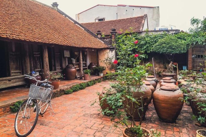 Next, we freely explored the ancient houses in Duong Lam, all steeped in the tranquil ambiance of rural villages. Our guide recommended several houses, including those of Mrs. Duong Thi Lan, Mr. Nguyen Van Hung, and Mr. Ha Nguyen Huyen. These homes, over 400 years old, stand out with their red-tiled roofs and stone walls, typical of the Vietnamese countryside.